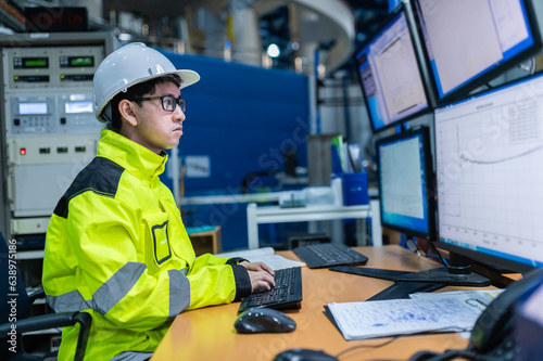 Inside the large Industry Factory Female Computer Engineer Works on Personal Computer She coding program for control machine,Thailand people work on fours monitors,Programmer working with serious