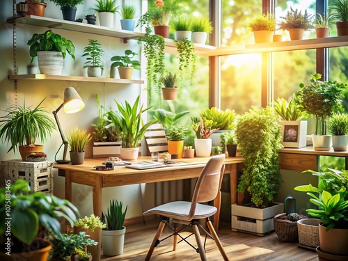 Inspiring Creative Workspace with High Depth of Field, Showcasing Modern Desk, Lush Plants, Unique Decor, Bright Natural Light, and Organized Stationery in a Cozy Setting