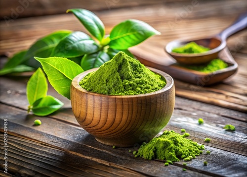 Instant Matcha Green Tea Powder in Wooden Bowl with Leaves - High-Resolution Stock Photo