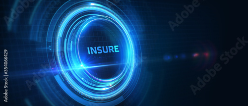 Insurance concept. Client click on insure button. Insurance icons: car, travel, family and life insurance, financial and health. 3D illustration.