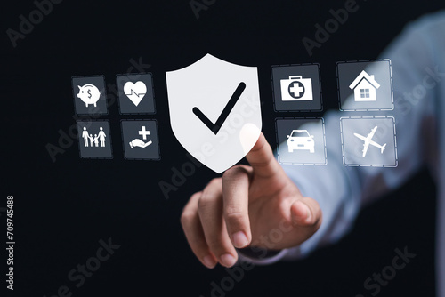 Insurance concept. Businessman touch virtual insurance icons to car, travel, family and life, financial and health insurance.