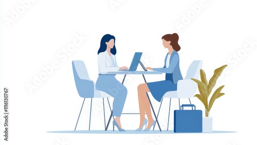 insurance premium travel concept, Two women engage in a professional discussion at a modern table, working on laptops in a bright, minimalist office environment.