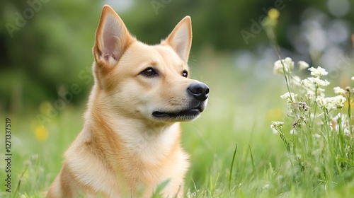 Intelligent Corgi Dog Sitting Gracefully Among Lush Green Grass and Wildflowers : Generative AI
