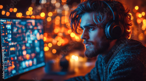 Intense, backlit atmosphere as young man in headphones works on his laptop