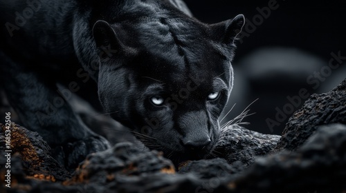 Intense Black Panther Focused in Dark Environment with Striking Eyes and Textured Background