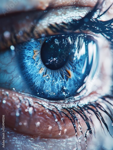 blue eye, intense, closeup, water droplets, macro, eyeball, reflective, glistening, condensation, iris, pupil, detailed, sparkling, moist, shiny, wet, dewy, crystal-clear, raindrop, eyelash, gleaming, saturated, liquid, soaked, glistering, condensed, sparkle, high-coloured, lustrous