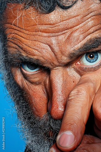 blue eye, closeup, wrinkle, beard, pointing finger, emotion, background, portrait, sharpened, gaze, direct, communication, character, detail, elderly, face, feeling, dramatic, intensity, age, storytelling, depth, rugged, expression, personal, individual, emphatic, strong, real