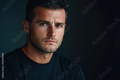 portrait, man, expression, gaze, thoughtful, natural light, indoor, dark background, feature, mood, serious, young adult, intensity, emotion, contemplation, atmosphere, style, closeup, contrast, masculinity, depth, character, storytelling, personality, art, candid, visual, sharpened, charme, realism, simplicity, engagement, aesthetic, human, beauty, connection, lifestyle, design, elegance, narrative, presence, sincerity, vibe, moment, artistry