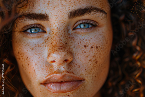 closeup, portrait, woman, blue eye, freckle, intensity, natural, allure, young, facial, feature, beauty, striking, detailed, gaze, captivating, sincerity, simplicity, purity, lighting, curly, hair, depth, texture, complexion, ai, generative