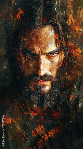 man, portrait, intense, closeup, serious, expression, beard, hair, dark, artistic, fiery, colours, emotion, mystery, drama, photo, character, detail, atmospheric, face, eye, texture, deep, background, male, rugged, style, emotion, art, creativity, powerful, striking, captivating, unique, light, shadow, raw, nature, strength, intensity, conceptual, visual, portraiture, male model, bold