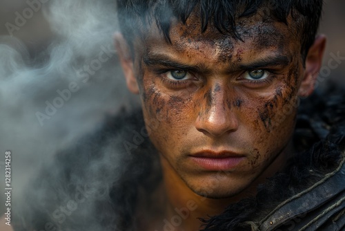 Intense portrait of a young warrior covered in dirt and smoke during a battle preparation in a forest setting