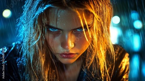 Intense rainy night portrait of a young woman with drenched hair and striking gaze in a vibrant urban setting
