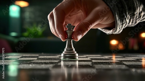 Intense strategic chess match indoor cozy setting close-up gameplay focus intimate atmosphere hand detail concentration and tactics