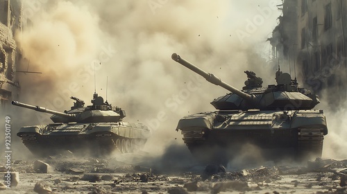 Intense Street Battle Scene: 3D Illustration of Two T72 Tanks Amid Smoke and Destruction with HD Quality