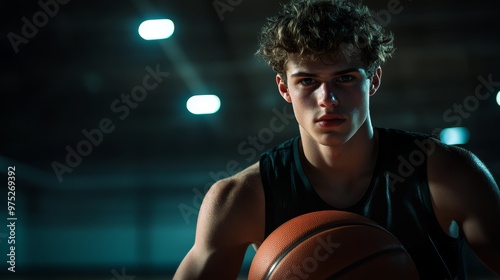 Intense Young Man Holding Basketball in Dramatic Indoor Arena Lighting