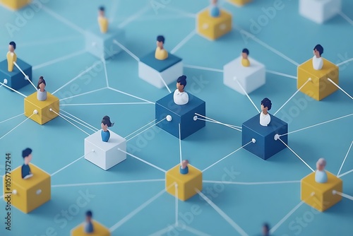 network, connection, team, collaboration, community, communication, interaction, human relationships, linkage, society, group, people, human, miniature, figure, person, blue, yellow, white, cube, square, block, string, thread, line, pattern, abstract, minimal, modern, geometric, graphic, design, concept, idea, business, social, digital, illustration, three-dimensional, rendered, model, abstract art, interconnected, synergy
