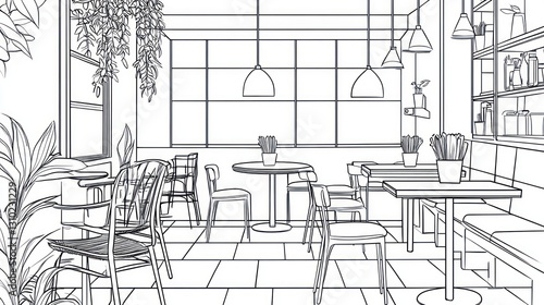 Interior cafe sketch, plant decor, simple design, graphic illustration