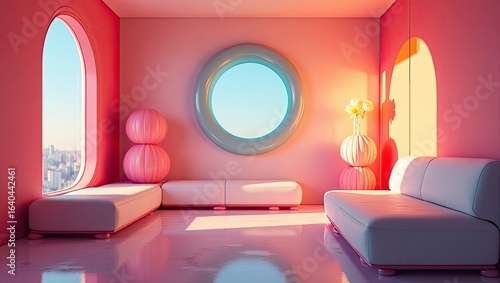 airy, modern, art, high-coloured, decor, roomy, colours, architecture, city, apartment, sunlight, interior, window, bright, colourful, creative, decorative, stylish, living, minimalist, elegant, sofa, contemporary, geometric, room, circular, pastel, rendering, view, beautiful, furniture, brightly, modernism, three-dimensional, roomy, pink, urban, design, home, space, professional, white, light, stylised, vibrant, arch, couch, decoration