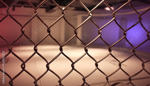 cage, metal, fence, interior, lighting, space, room, wall, white, purple, red, empty, modern, geometric, dim, light, view, perspective, structure