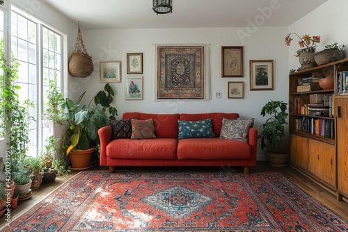 living room, interior, sofa, red, plant, rug, patterned, home, decor, decoration, furniture, cushion, pillow, bookshelf, book, art, wall, white, light, window, bohemian, style, cosy, comfortable, design, potted plants, wooden, floor, carpet, artwork, frame, cabinet, bright, sunlight, indoor, room, house, apartment, residence