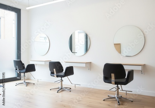 Interior of a modern hair salon with three styling stations, round mirrors, and black chairs in a minimalist design