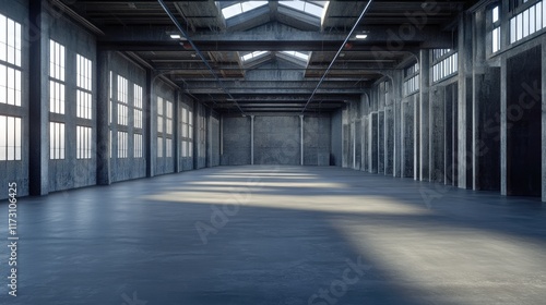 building, industrial, factory, warehouse, empty, large, roomy, concrete, floor, wall, window, sunlight, light, shadow, steel, beam, ceiling, architecture, interior, design, grunge, textured, weathered, aged, old, modern, minimalist, huge, expanse, perspective, depth, line, geometric, pattern, grey, blue, colours, tone, atmosphere, mood, ambience