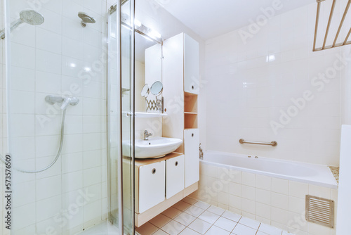 interior, design, bathroom, shower, cabin, bathtub, vanity, unit, sink, mirror, bathe, property, minimal, tidy, modern, washroom, domestic, sanitation, white, tile, everyday, sanitary, hygiene, routine, faucet, light, tap, tub, new, cleanse, clean, washbasin, cabinet, glasses, door, private, contemporary, estate, home, daily, indoor, inside