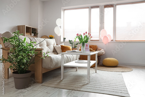 Interior of light living room decorated for Women's Day with sofa, table and balloons