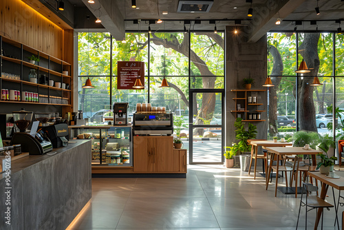 Interior of modern cafe and coffee shop with wooden and concrete walls, 3d render. Nobody inside. Generative AI