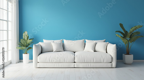 Interior of modern living room with white fabric sofa over blue wall 3d rendering