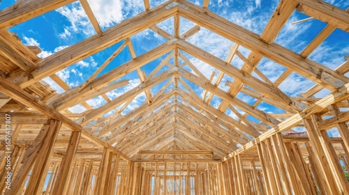 house, home, support, sky, progress, wooden, roof, design, framing, architecture, wood, structure, beam, daylight, building, interior, detail, frame, construction, sun, under, material, exterior, sunlight, framework