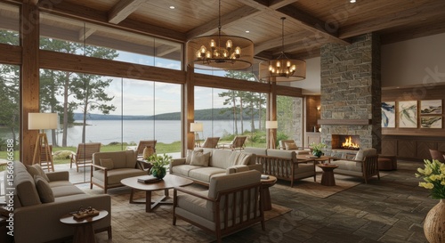 Interior view of a luxurious living room with lake view and fireplace in a modern home design