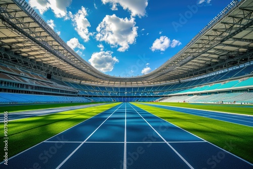 stadium, athletic, track, field, interior, sport, arena, race, running, lane, competition, event, grass, turf, bleacher, seat, crowd, spectator, lighting, roof, architecture, design, modern, professional, venue, sprint, hurdle, jump, throw, pole, vault, shot, put, finish, line, start