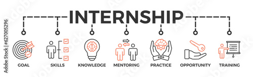 Internship banner web icon vector illustration concept with icon of goal, skills, knowledge, mentoring, practice, opportunity, and training