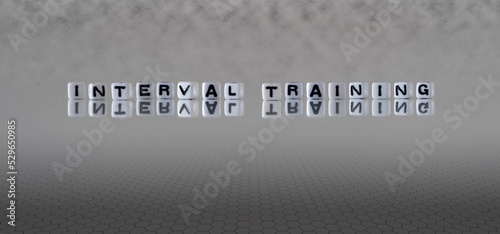 interval training word or concept represented by black and white letter cubes on a grey horizon background stretching to infinity