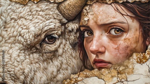 Intimate Encounter Between a Young Girl and a Majestic Animal Captured in a Vivid, Textured Wall Fragment, Symbolizing Connection to Nature and Emotion