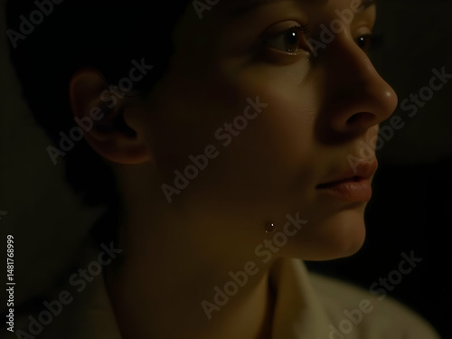 woman, teardrop, gold, light, glow, face, skin, emotion, delicate, solitary, portrait, female, beauty, closeup, profile, human, expression, sorrowful, care, sensitivity, elegance, mood, pensive, dreamy, thoughtful, looking, quiet, gentle, refined, subtile, tenderness, vulnerable, glistening, cheek, eyebrow, eyelash, smooth, complexion, clear, clean, soft, warm, serene