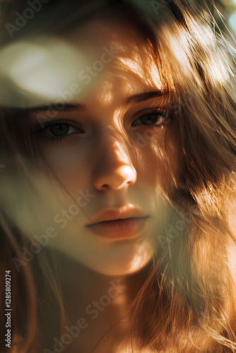 Intimate Portrait of Young Woman with Sunlight Casting Shadows on Her Face : Generative AI