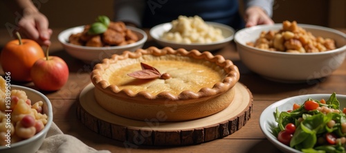 Intimate Thanksgiving scene centered around golden-brown apple pie and vibrant vegan dishes festive family gathering implied by blurred celebration background