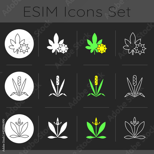 Intolerance for allergen dark theme icons set. Castor bean. Timothy grass. Flower pollen. Common reason for allergy. Linear white, solid glyph and RGB color styles. Isolated vector illustrations