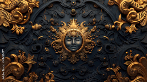 Intricate 3D illustration featuring an ornamental design with a central sun medallion and a face surrounded by elaborate floral and swirl patterns in gold and dark blue.