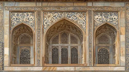 Intricate architectural detail of marble palace windows with floral designs art old blue stone beige