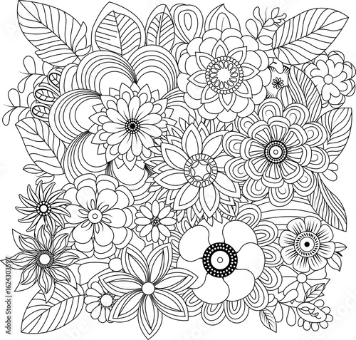 Intricate black and white floral pattern with detailed hand-drawn petals and leaves