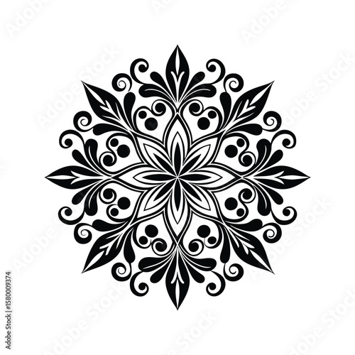 mandala, floral, ornamental, black, white, vector, illustration, design, pattern, symmetric, decorative, intricate, swirling, leaf, flower petals, dot, graphic, art, traditional, vintage, elegant, clean, simple, isolated, background, motif, flourish, scrollwork, bloom, nature, symmetry, graphic design