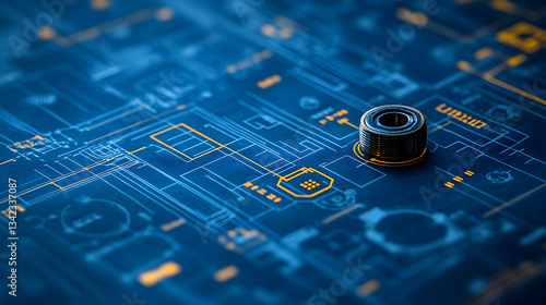 Intricate circuitry with a single precision bearing. A deep blue and gold palette adds depth and sophistication