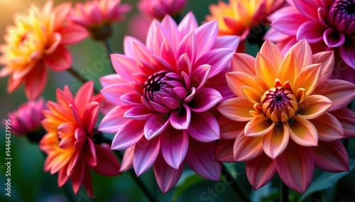 Intricate dahlia blooms, vibrant colors, lush petals , high resolution, nature, retro