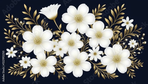 Intricate Floral Arrangement with White Flowers and Golden Leaves on Navy Background