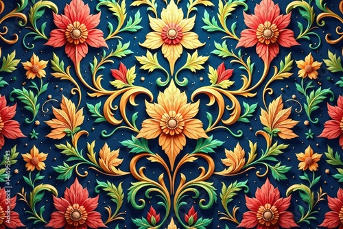 Intricate floral damask pattern, elegant swirls & leaves, antique, repeating, design