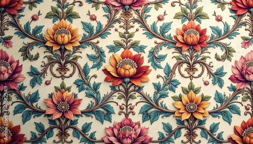 Intricate floral damask pattern in muted tones, brown, scrolls, gray