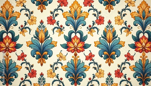 Intricate floral damask pattern in muted tones, fabric, swirls, beige